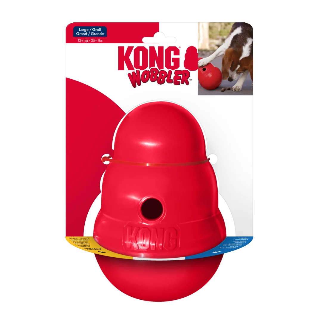 De KONG Wobble is een actievol speeltje dat tevens een mentaal stimulerende voerdispenser is. Het KONG-vormige speeltje blijft rechtop staan totdat het door de poot of neus van de hond wordt aangestoten. Terwijl het wiebelt, draait en rolt, geeft het smakelijke beloningen af. De onvoorspelbare bewegingen stimuleren de natuurlijke instincten van de hond en zorgen ervoor dat zelfs de meest ervaren gebruikers uitgedaagd blijven. De KONG Wobbler kan ook gebruikt worden als alternatief voor een voerbak, waardoor de maaltijd langer duurt en uw hond tegelijkertijd voldoende beweging krijgt.